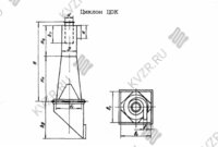 Циклон пылеуловитель ЦОК 5 с обратным конусом состоит из корпуса с входным патрубком, внутреннего конуса, выхлопной трубы и пылесборника. Пылесборник может быть в виде бункера или выдвижного ящика. Короткая часть цилиндрического корпуса переходит в расширяющийся книзу конус, непосредственно присоединяющийся к пылеприемному бункеру. При установке агрегата на кронштейне бункер имеет коническую форму, а к пылевыпускному отверстию может подсоединятся затвор типа «мигалки» или шиберный затвор. Рекомендуется установка на кронштейне аппарата диаметром не более 300 мм. Для повышения эффективности пылеосаждения и предохранения осевшей пыли от взмучивания и уноса из бункера в нижней части агрегата устанавливается внутренний конус. Угол при основании внутреннего конуса зависит от рода и характера осаждаемой пыли: для сухой пыли — 45°, для сажи и талька — 60°.